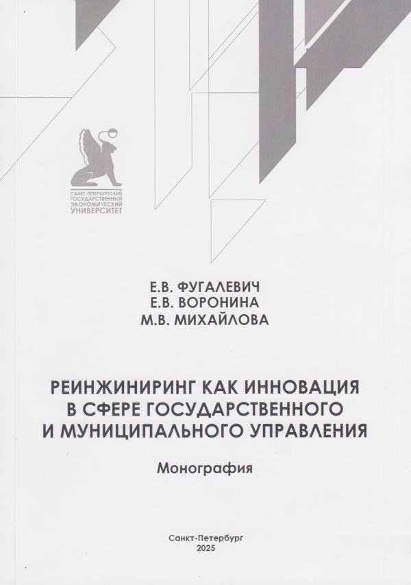 Фугалевич Елена Владимировнаа. Реинжиниринг как инновация в сфере государственного и муниципального управления : монография / Е.В.Фугалевич, Е.В.Воронина, М.В.Михайлова ; М-во науки и высш. образования Рос. Федерации, С.-Петерб. гос. экон. ун-т, Фак. упр., Каф. гос. и территор. упр. — Санкт-Петербург : Изд-во СПбГЭУ, 2025. — 1 файл (7,07 Мб). — Загл. с титул. экрана. — Имеется печ.аналог -Авторизованный доступ по паролю. — Текст (визуальный) : электронный. — Библиогр.: 18 назв. и в подстроч. примеч. — ЭБ OPAC.UNECON.RU. —