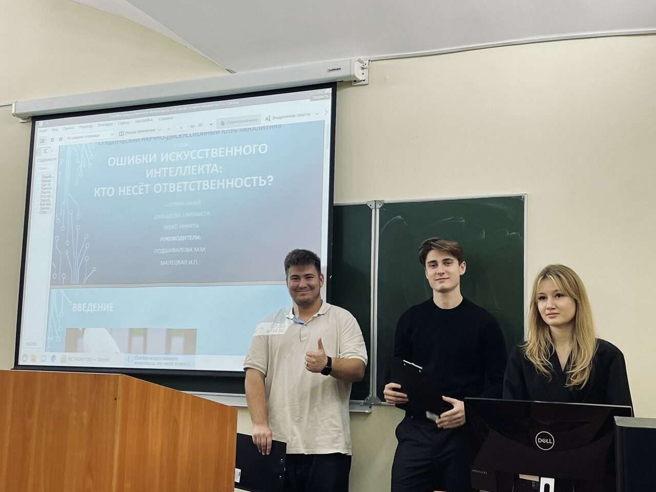В заседании приняли участие студенты 4 курса направления «Экономика» группы Э-2206. Доклады, представленные Батуриным Акимом, Давыдовой Елизаветой, Зубко Никитой «Ошибки искусственного интеллекта: кто несет ответственность?», Фоминой Екатериной, Попандопуло Дарьей «Бухгалтерия в облаках: что будет, если интернет отключат?» и Осиповой Владой, Титовой Екатериной «Риски искусственного интеллекта в финансовом анализе и прогнозировании прибыли российских компаний» вызвали живой отклик у аудитории и переросли в интересную и актуальную дискуссию. Встреча была интересной и познавательной, спасибо всем за участие!