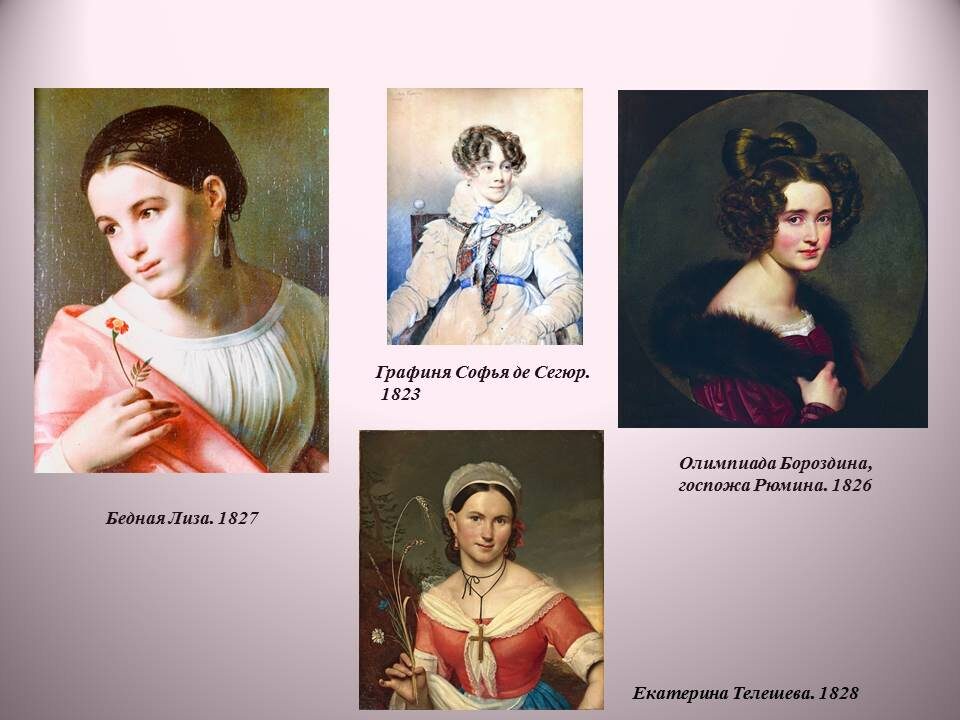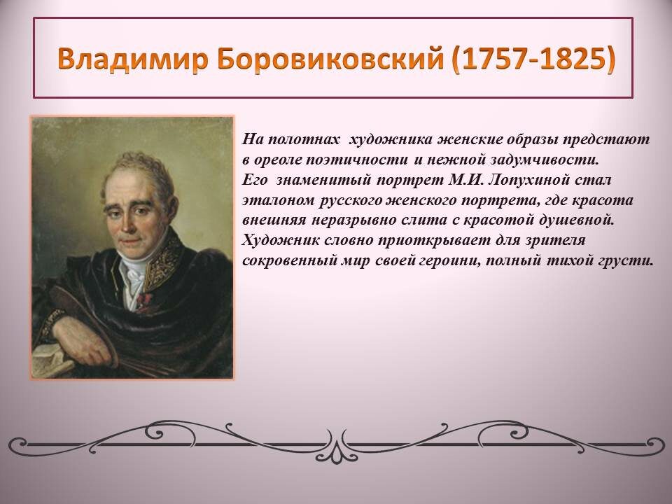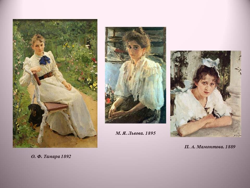 В самом конце века, на грани XIX столетия, Боровиковский создает целый ряд портретов, по преимуществу женских и девичьих, в которых окончательно находит самого себя и вместе стем утверждает в портретной живописи новый тип человека. В таких изумительных портретах, как портрет В.И. Арсеньевой, М.И. Лопухиной, Е.А. Нарышкиной, М.А. Орловой-Денисовой, со всей силой обнаруживаются особенности портретного стиля художника. Все эти портреты полуфигурны. В постановке фигуры Боровиковский разрабатывает прием, впервые найденный в портрете Капниста.