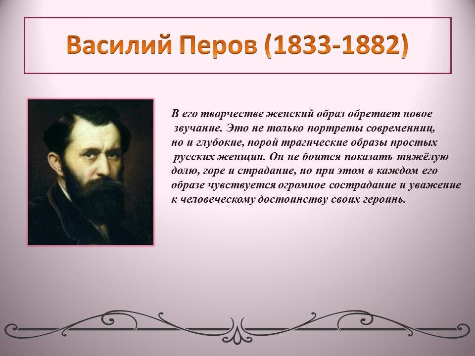 Альбом репродукций произведений Василия Григорьевича Перова (1833-1882). Перов принадлежит к числу художников-демократов старшего поколения, основоположников русской идейной реалистической живописи второй половины XIX века. Основные качества Перова-мастера заключаются в серьезности подхода к теме, удивительной обдуманности её, чрезвычайно разносторонней психологической выразительности и, наконец, в умении связать человеческую фигуру с прекрасно разработанным чисто русским пейзажем, благодаря которому художник повышает эмоциональное воздействие картины на зрителя.
